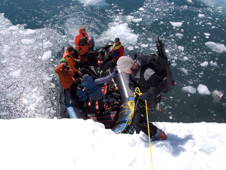 Not all of the landings were easy. Here, Colin Witherill handlines down into the zodiac while it tries to maintain its position on the shore.