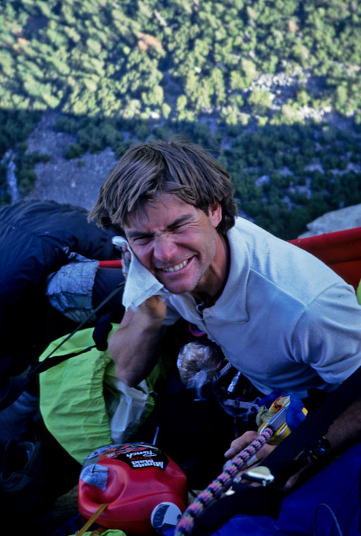 Tribal Rite on El Cap. This was a wild line with tons of exposure and great climbing. At the time, it was kosher to pitch your shit bags off of the cliff and in doing so one day, a piece of TP with a little brown anchor detached itself and floated around us in the updrafts. At first it was just funny, but twenty minutes later when it kept following us, it earned the name "Casper the Unfriendly Poop Ghost." It finally floated away.