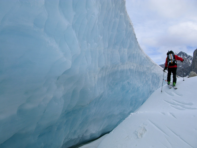 Courtney stepping past a wall of ice on the Revelation Glacier.