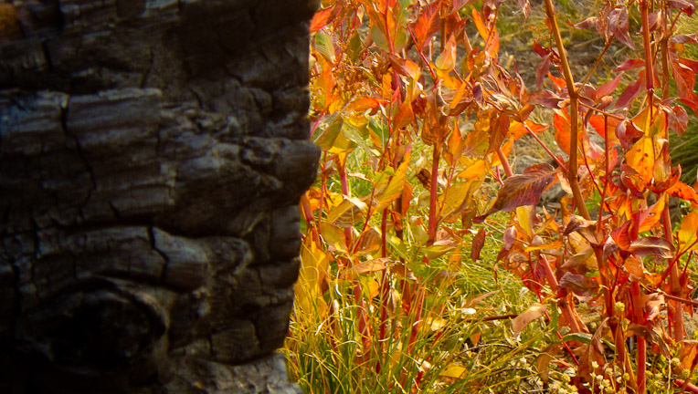 Charred trees and bright autum foliage.