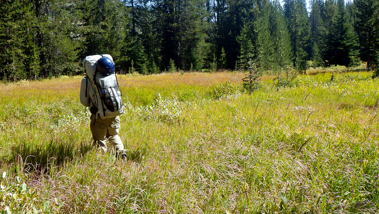Forrest bajas through the trail-less section of Beaver Creek.