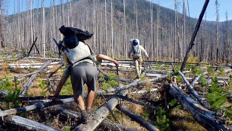 Blow-down in the Beaver Creek basin, more commonly known as "Phuksticks." This was very slow going and this photo only shows the easy part. Many sections were 8' over a boggy marsh which was covered in thorns. Misery ensued.