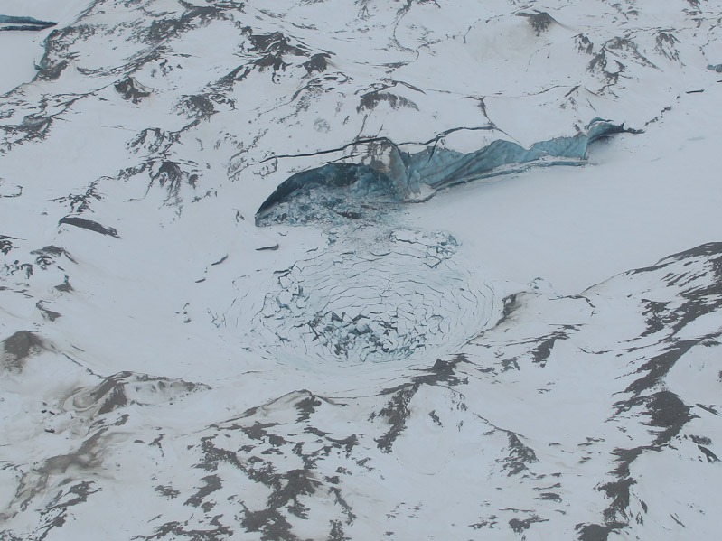 Some sort of collapsed sinkhole in the middle of a glacier.