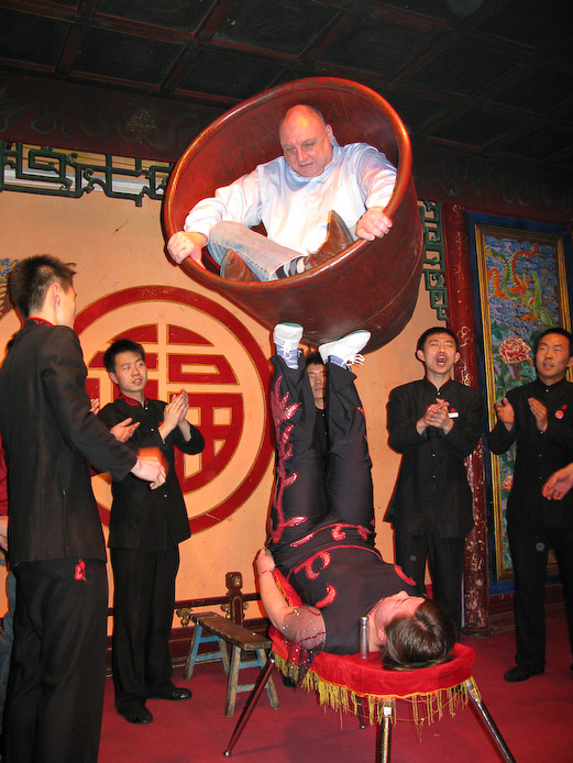 This would not pass legal muster in the US - a small Chinese girl spins a bucket containing a large, worried American in a restaurant.