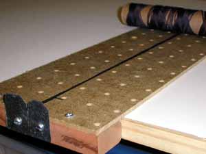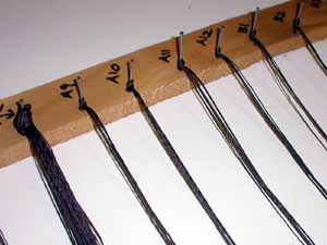 b) My racking device - a piece of wood with numbered nails. Do all the cutting at once, then all the tying. |