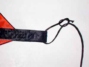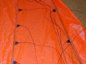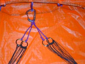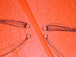 e) Starting at the top, tie two A lines, then a B line, then two A's, then a B, (etc.) into the rings. A11 &12 and B5 & 6 go to a seperate ring to form the brakes. |